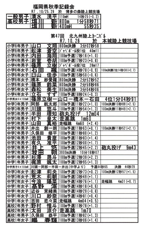 福岡県秋季記録会、第47回北九州陸上カーニバルの記録